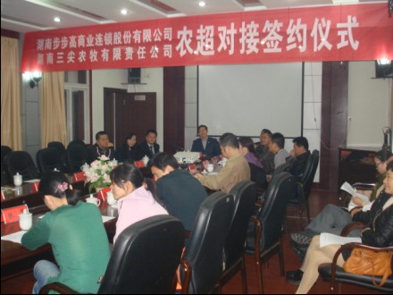 在熱烈友好的氣氛中,公司董事長(zhǎng)陳瓊武先生與步步高商業(yè)連鎖總裁陳志強(qiáng)先生互簽了農(nóng)超對(duì)接協(xié)議。